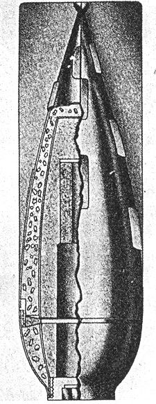 The bomb consists of two containers made of mild steel sheet. The space between them is filled with steel pellets embedded in concrete. The nose and the body of the bomb are apparently loaded separately with their filler of concrete and steel. A brown substance, which tops the nose filling, forms a cushion between the concrete filling. It appears to be a waterproof composition, containing a resinous wax. |