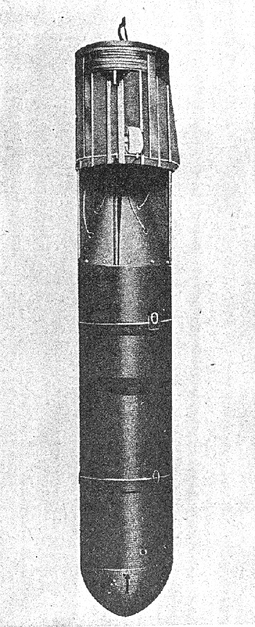 The tail cone, carrying four fins, is fitted by screws to the body. A corrugated ring strut strengthens the tail fins. Below the drum and situated between each pin of adjacent fins is a drogue of pressed steel. Each of these drogues is connected to its neighbor by a fabric wb fixed to the sides of the drogue by rivets. |