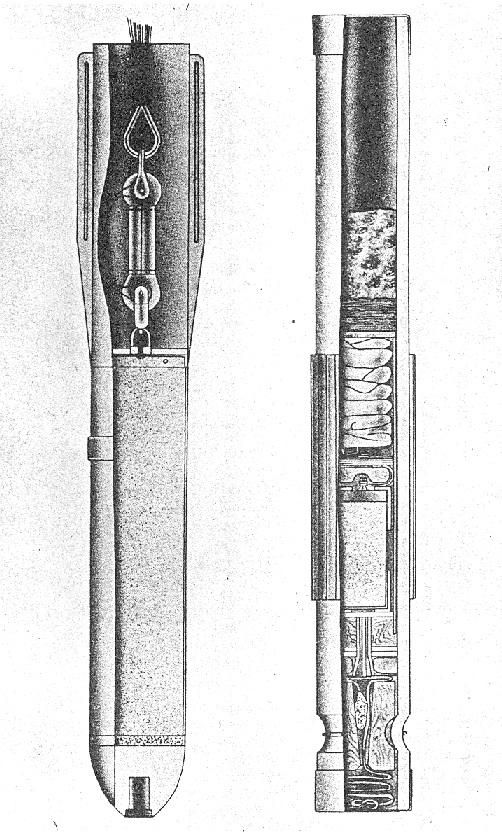This flare is contained in a cardboard tube the same thickness throughout its length. A corrugated cardboard 3.9 inches long surrounds the tube near the center to form a grip. Below the grip the tube is constructed to fits into the groove in the wooden plug at the nose and is held by a wire. The open ends of the tube are sealed by paper gummed over. In central hole of the wooden plug is a friction igniter. This consists of a friction compo-sition attached to the end of a short length of string impregnated with a phosphorus composition. The flare operates by breaking the seal at the nose end and pulling the string, which ignites the friction composition. This, in turn, ignites the safety fuse, which gives approximately two seconds before igniting the powder charge located below the candle. The charge ignites the candle and at the same time ejects the candle and para-chute from the tube. The resistance to the expelling charge is provided by a felt washer and waste packing at the top of the tube. |