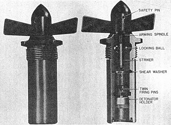 When the bomb falls from the plane, a safety pin which passes through cap and upper part of the fuze is removed, permitting the vanes to rotate and the arming spindle to rise in the striker assembly. When the arming has moved past, the balls roll inward, freeing the striker except for the shear washer. On impact, the head of the striker assembly acts as an anvil and the whole assembly is driven back, shearing the washers, and the firing pins fire the detonators, which in turn fires the explosive train. |
