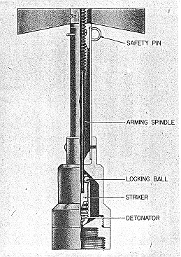 The safety pin is withdrawn. When the bomb is realesed, the vanes rotate and rise, along with the arming spindle. When the arming rod has risen 0.4 in., the steel balls are released, fall into the channel, and disengage the striker. The striker then rests on the creep spring. Upon impact, the creep spring is overcome; the striker and detonator con-tact and initiate the explosive train. The striker housing is spherical at the end and rests on the curved surface of the adapter. This assures that the fuze will operate, regardless of the position in which the bomb hits. |