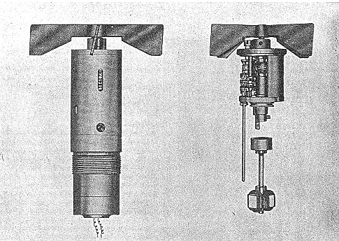 The exterior of the fuze body is cylindrical, with the lower part pressed and threaded for assembling into the nose of the bomb. The upper part of the body encloses the height meter, gear train, electrical contacts, and central shaft with release pawl. The lower part houses the armature and its shaft. On the upper end of the shaft is mounted the clutch; at the other end, the cap is screwed in. The vanes are fastened to a spindle in a hub on top of the meter housing. A setting nut is also located on the top of the meter housing and is used to set the height meter. Two insulated wires lead from the base of the fuze to an electric detonator. One lead is connected to the cap, the other to the rod which leads to the contacts in the meter housing. |