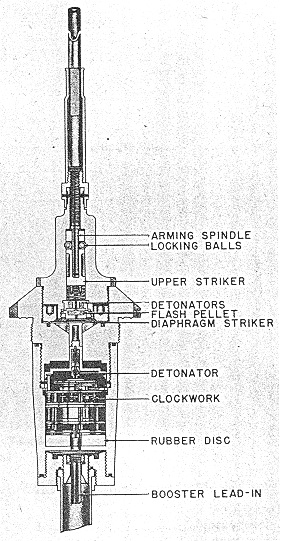 At the same time, the arming plate is forced down, causing the rod to move and free the clockwork. The lower striker is also brought closer to the detonator. After the delay time has elapsed, a detent in the clockwork frees the hollow central shaft, which moves up-ward under a spring load to impact the striker. The detonator is fixed, and the flash pas-ses down the central shaft to the booster. |