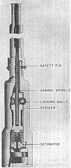 The safety pin is removed, and on release the vanes rotate in a counter-clockwise direc-tion, turning the fuze body extension. The arming spindle is completely unscrewed from the inertia striker, permitting the ball bearings to come together to free the striker from the body. On impact, the striker compresses the creep spring, and the firing pins punc-ture the detonator caps to initiate the explosive train. |