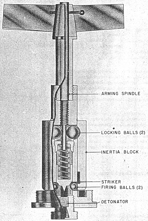 On release, the safety pin is withdrawn, allowing the vanes to rotate. When the vanes rotate enough to raise the arming spindle 0.5 in., the steel balls move inward, freeing the arming sleeve. On impact, the sleeve sets down into the recess in the base of the fuze and so frees the firing balls. These are pressed out-wards into the groove in the arming sleeve, and the striker is thus released. |
