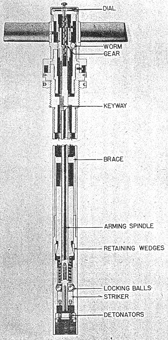 The setting key is turned so that the dial indicates the depth of function, 0 - 90 meters. The 0 - 90 meter range corresponds to 0 to 35½ rotations of the vanes, althrough it is impossible for operation of the fuze at less than 9 meters depth in water. |