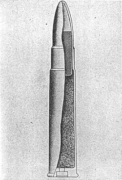 This round is interchangeable with the British 0.303-in. and is almost identical to the Bri-tish Mk VII. The bullet has a copper-nickel plated steel jacket enclosing an aluminum for-ward core and a lead core in the rear. |
