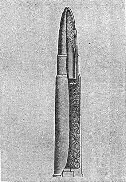 This round consists of brass cartridge case, a copper cap, and a bullet whose jacket is pierced with four holes on the ogive so that at these points the incendiary composition is protected only by a thin copper sleeve. The jacket is steel plated with either copper-nickel or copper-nickel alloy. A copper sleeve, a steel core in a lead sheath, and the for-ward nose position filled with phosphorus are enclosed by the bullet jacket. The four ho-les on the ogive permit the distrubution of the phosphorus on impact. |