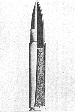 This round consists of a brass cartridge case and a bullet which is made up of a lead core enclosed in a plated jacket. |