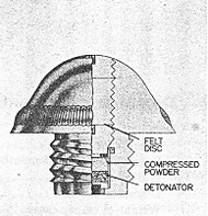 One firing, the top inertia ring sets back and overcomes the upper stirrup spring. On im-pact, the striker overcomes the lower stirrup spring, withdraws the copper closing plug from the flash-hole, and forces the firing pin into the detonator. |