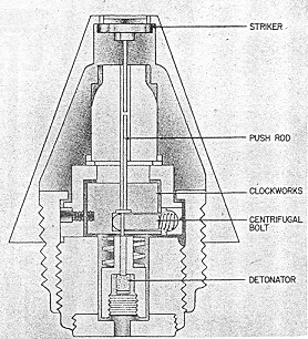 On firing, the centrifugal bolt immediately moves outwards, unlocking the horse-shoe centrifugal which is held by clock mechanism during acceleration, since friction set up between the comparatively large surface of the contact of the cog-wheels is sufficient to prevent outward movements of the bolt. On deceleration, however, the cogwheels set forward and separate, and allow the horseshoe centrifugal bolt to move outwards, re-leasing the firing pin which, however, remains in position because of deceleration. On im-pact with a soft surface, the detonator moves forward to hit the firing pin. On impact with a hard surface, the striker is forced down, hitting the connecting rod, which in turn causes the firing pin to hit the detonator. |