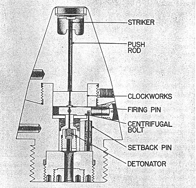The clockwork mechanism has a train of four wheels, each consisting of spur and pinion, and a balance wheel oscillator. The nose of the fuze, drilled through its center to take the striker and aluminum connecting rod, is closed against air pressure by a brass disc. The safety bolt forks at the inner end to provide two arms which pass under a collar of the firing pin to prevent the pin from moving towards the detonator. A recess to engage a detent is located on the underside of the bolt, and a hole in the center of one side en-gages the stem of the spring-loaded centrifugal locking bolt. In the opposite side of the safety bolt, a toothed rack is emmeshed with the first spur of the clockwork escapement mechansim. The detonator holder is kept in position by a creep spring. |