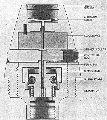 This is an aluminum fuze. In the body is a brass container which holds the clock mecha-nism composed of a train of four wheels and an oscillator. Passing through the body of the fuze is a centrifugal safety bolt which is fitted with a slot. This centrifugal bolt is also fitted with teeth which engage the teeth of the first wheel in the train series. Pass-ing through the center of the brass container is a firing pin with a collar at its midpoint. The firing pin is kept in the upward position by the collar resting on the top of the centri-fugal safety bolt. In the lower part of the fuze is the detonator holder, which is fitted on the outside with ball bearings which bear against the brass ring. Below the detonator holder is a spring under compression. Screwed into the base of the fuze is a booster. |