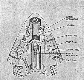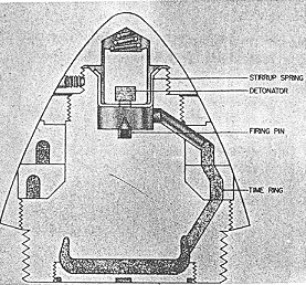 M06/17: On acceleration, the detonator holder overcomes the stirrup spring and sets back, carrying the detonator to the firing pin. The flash produced is transmitted to the perforated pellet in the upper time ring, starting the fuze powder burning. The fuze burns around to the perforated pellet in the lower time ring and ignites the fuze powder. The lower ring burns and ignites the pellet in the fuze base which in turn flashes to the main charge. |