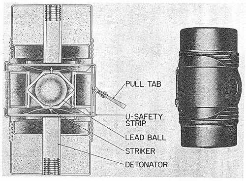 The grenade body is of three parts, the two end caps threading into the middle section. Two shallow cones of aluminum, each with a striker and the center of a four-prong stir-rup spring at its apex, are contained in a 1½-in. diameter cylinder held in the middle sec-tion by two collars. One of the cones is at each end of this cylinder and, in the space formed, is a heavy lead ball 1 in. in diameter. The action of the ball in this cavity makes the fuze "allways" acting. The detonators are held in two cylindrical tubes, one attached to the center of each end cap. The end cap is closed by a metal cover, and the explo-sive filling is contained therein. The first safety strip consists of a rubber pull tab and a one-piece U-shaped bar or light, soft metal. Each end of this passes through an opening in the middle section, between a striker and a detonator, to protrude slightly through the opposite side of the body. The second safety strip is attached to the hinged wing-sha-ped safety cap which passes around the body over the middle section. There are two bars, each to pass through the body and cover striker. Thus each striker is held from its detonator by a stirrup spring and two safety bars. |