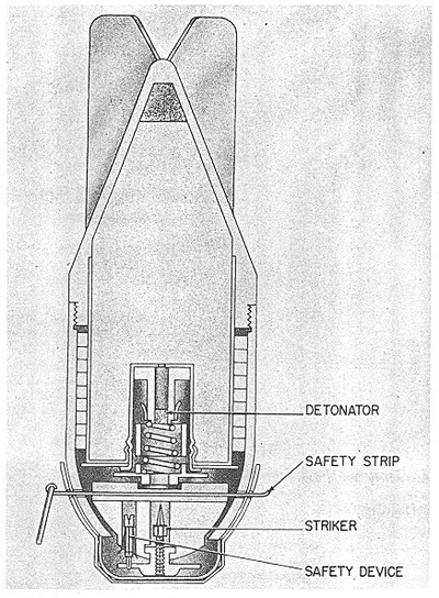 On withdrawing the safety strip, the cap is freed; and, on firing, the setback causes the safety device to move down into its slot. This safety device consists of a short brass rod which projects into one of the holes in the disc and holds the disc from rotating. Four light brass spring strips hold the rod in the "setback" position. At the same time, the col-lar also set back onto the firing-cap holder, being held in position by the detent spring. The collar and holder of the spring. During flight, the disc rotates as air passes through the oblique holes near the edge of the disc. The striker, being prevented from rotating by the square shape of the portion moving in a square-shaped channel, is thus moved to-ward the detonator. The grenade is then armed. On impact, the detonator rides forward on the spring and hits the striker. |