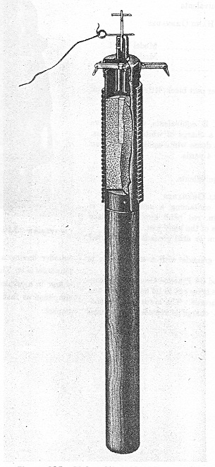 The mine proper consists of a thin sheet metal cylinder around which is wound the strip metal loading. The mine is mounted on a wooden picket and contains a 100-gram cartrid-ge of TNT. The mine is closed by a screw-on lid which carries the spring-loaded striker. |