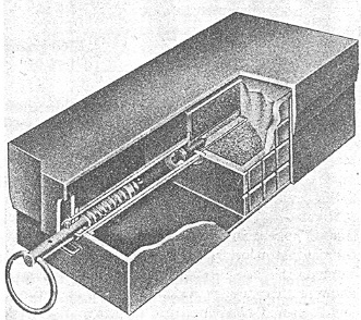 One to five pounds pressure on the hinged lid presses the trip-key out of the hole in the striker. This action releases the striker, which is driven by the striker spring into the cap, detonating the main charge. |