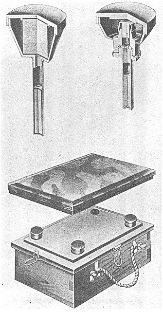 Four holes in the lid of this box accommodate four igniters, and the mine is complete by the addition of a false lid which consists of a movable pressure platform attached to a wooden frame by means of canvas. |