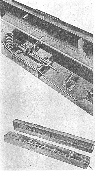 A detent with a spring provides against premature firing in the event of damage to the tension wire, and, when the lid is depressed, insures normal function by pressure on the lever, which releases the detent. This additional safety device is not found on all types. |