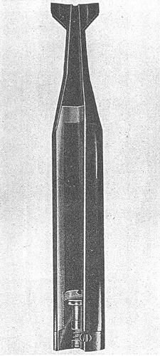 The bomb bodies are cylindrical castings of magnesium alloy, with the nose internally threaded to take a nose fuze. Toward the nose, the bomb casing is perforated by two small vents, plugged with wax. The bombs differ in tail assemblies, with Type A consist-ing of three sheet-metal vanes supported at the ends by a circular ring and Type B con-sisting of a cast-alloy tail cone and eight vanes. |