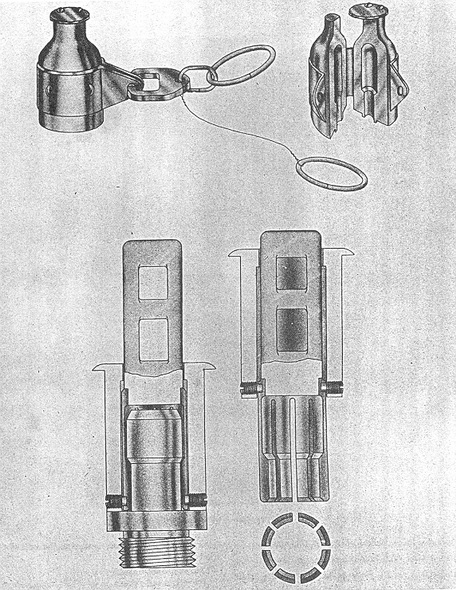 1. Safety device Model 1928: This device is incorporated with the 1928 and 1929 Mo-dels of the R.S.A. Fuze when used for horizontal suspension of 10 and 50-kg bombs, and is shown at the top of Figure 262. It is also used in a slightly modified form with R.S.A. Fuze Model 1925. It consists of two symmetrical steel hoods joined by a band of spring steel. The interior of these hoods is shaped to conform with the contour of the fuze head. The safety device is closed by means of a clip to which cord and a ring are atta-ched. The latter is attached to the ball-release cord, so that the clip is pulled away when the bomb is relesead. The safety device then opens during the descent of the bomb and falls away. |