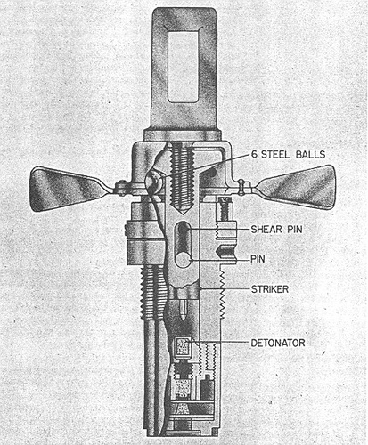 These fuzes are similar in outward appearance, differing mainly in size and detonator as-sembly, but both are easily distinguished by the square eyebolt on the upper cap. Six-teen vanes are formed on a ring riveted to the cap. The base of the eyebolt has a bolt formed with it which screws into the striker. Between the striker plate and the upper locking ring of the body are six steel balls. |