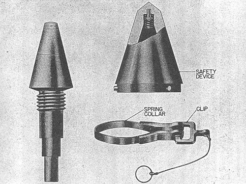 At the apex inside the dome, there is a spring which is compressed when the hood is pla-ced on the fuze. Around the base of the hood are three spring loaded detents. The clip fits around the base of the hood and compresses the spring-loaded detents, which are pressed into the A-groove on an adapter which screws into the bomb. |