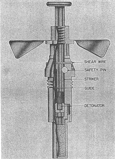 When the bomb is dropped, the safety bolt is removed. The vanes rotate and rise on the striker spindle. On impact, the striker is forced down, cutting the shear pin and contact-ing the detonator, initiating the explosion. |