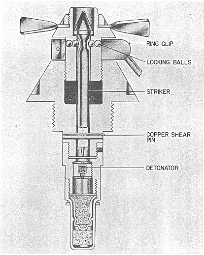 Upon being dropped from the plane, the safety clip is withdrawn, and the balls fall out, releasing vane housing. The vanes rotate and screw the vane housing into the recess of the body which exposes the striker head. Upon impact, the striker head is forced down, shearing the copper pin and striking the detonator cap, exploding the bomb. |