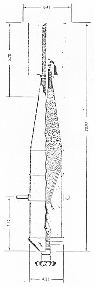 The bomb body consists of a sheet metal cylinder taper-ing in a cone to the base. A conical steel nose cap, threaded internally to receive the fuze, is welded in place. The base is closed by a plug, fitted with a filling sleeve adapter. The different fillings are separated by a conical shaped steel membrane. Three gas ports on the nose are closed by paraffin. |