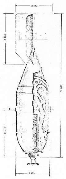 The body is formed of thin gauge sheet metal and con-sists of an ogival nose section, cylindrical main body section, and a conical base section joined together by welds. The central burster is fastened to the nose fuze adapter. |