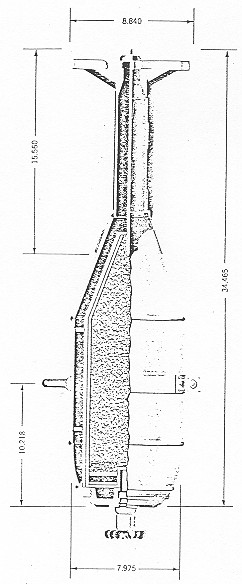 The bomb body consists of an inner and outer sheet me-tal container. The outer container is formed by welding together a nose cap adapter ring, ogival nose section, cylindrical main body section, and a conical base secti-on. An eraission tube is welded to the base section. The inner container is closed, at the nose, by a sheet metal can containing the initiator and primer. The nose cap is fastened to the adapter ring by means of screw threads, and is fitted with a fuze adapter. |