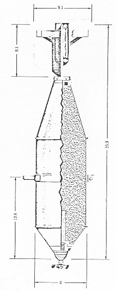 The tail consists of four fins welded to the adapter ring of the tail cone. The center of the tail contains a small cylinder which houses a parachute. Struts are welded between the fins for additional support. This bomb is also described as having only two fins. The four struts are welded between the fins and the cylindrical para-chute housing. |