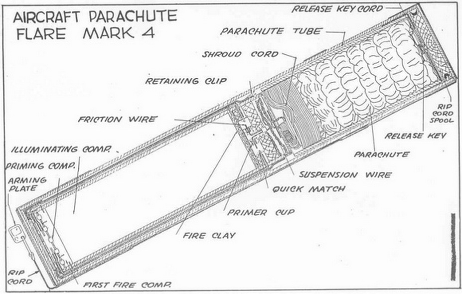 An ignition wire is attached to the suspension cable in such a manner that it is pul-led before the cable is fully extended. Four friction wires are attached to the ignition wire and run through primer cups of match compound. This ignites a double quickmatch train which burns down the outside of the illuminant case and ignites the primer compo-sition which in turn ignites the first fire and illuminant. When the parachute opens, the illuminant is pulled out of the flare case, and flare case falls clear. Full suspension and ignition occur about 30 - 50 feet below the plane. |