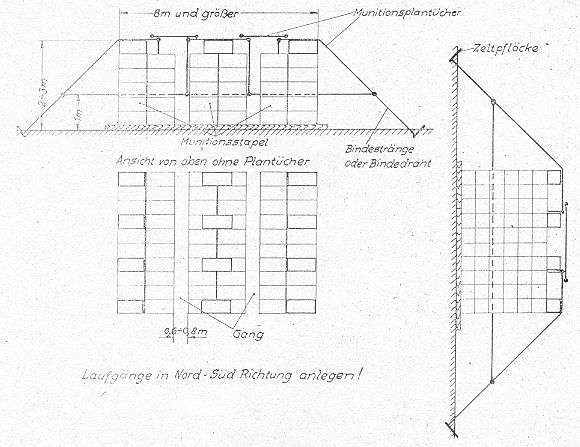 Zur Unterbringung größerer Munitionmengen ist es jedoch praktischer, die Muniti-onspackgefäße in Zelten aufzustellen und in jeder Zeile zwei Munitionspackgefäße mit dem Boden oder einer Stirnwand zueinander zu stellen. Jede Zeile erhält einen Durchgang von ungefähr 60–80 cm Breite, damit die Luft zirkulieren kann. Der ganze Munitionsstapel wird gleichmäßig hoch aufgebaut. In den Ecken und in der Mitte wird er ein oder zwei Packgefäße höher gebaut, auf denen die Mun.-Plantücher lie-gen, da meist Holz zum Aufbau der Stapel nicht vorhanden ist. Die einzelnen Muniti-onsplantücher sind an den Ösen zusammenzubringen, so daß ein großes Dach ent-steht, welches seitwärts im Winkel von 45° nach unten geführt wird und verankert ist. Die Kanten der Mun.-Plantücher müssen möglichst etwa 1 m über dem Erdboden liegen, damit ein genügender Luftzug entsteht. Vgl. Skizze. Die Munition in einem solchen Munitionsstapel bleibt verhältnismäßig gleichmäßig temperiert und kühl. Aus-serdem werden die Munitionsstapel nicht so stark von Ungeziefer, Schlangen, Ter-miten, Skorpionen aufgesucht. |