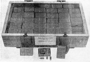 Braune Schachtel mit blauer Bezettelung