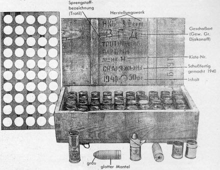 | Granate mit eingelegter Zusatzladung und Papierumhüllung in luftdichter Blechdose mit Abreißstreifen. |