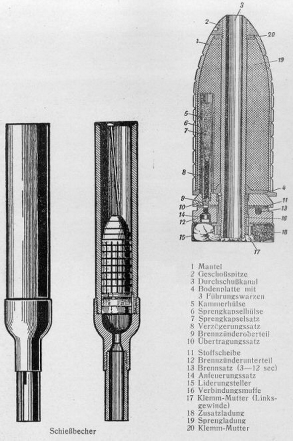 | Gewicht der Granate mit Büchse = 435 g | V0 ohne Zusatzladung = 54 m/sec |