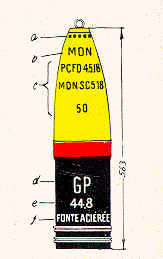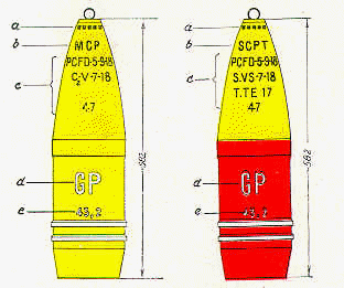 Anmerk.: | 1) | Dieses Geschoß kann auch mit reinem Sprengstoff gefüllt sein. Es hat dann statt des roten Farbkennzeichens einen gelben Anstrich |
