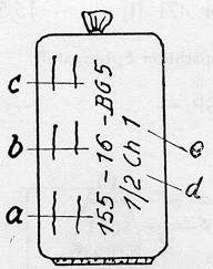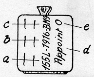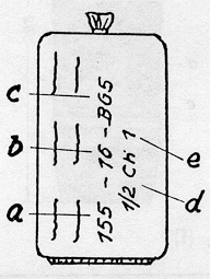 Große Ladung: In die Vorkart. wird auf das kleine Pulverbündel eine Kartuschvor-lage gelegt. In die Zusatzkart. kommt auf das Pulverbündel ebenfalls eine Kar-tuschvorlage. Bei der Hauptkart. wird das obere, mit einem Schild: »à enlever pour le tir de nuit charge 0« (– beim Nachtschießen mit der großen Ladung zu entfernen.) versehene kleine Pulverbündel entfernt und dafür auf das obere große Pulverbündel eine Kartuschvorlage gelegt. |
