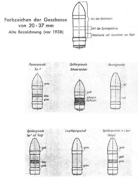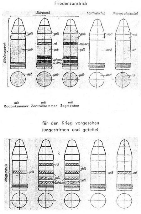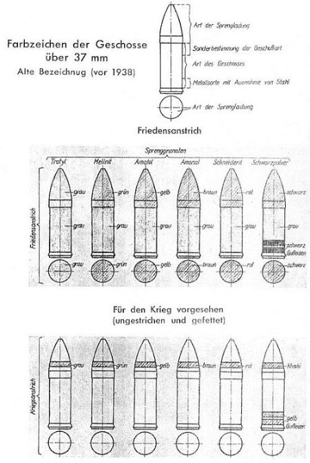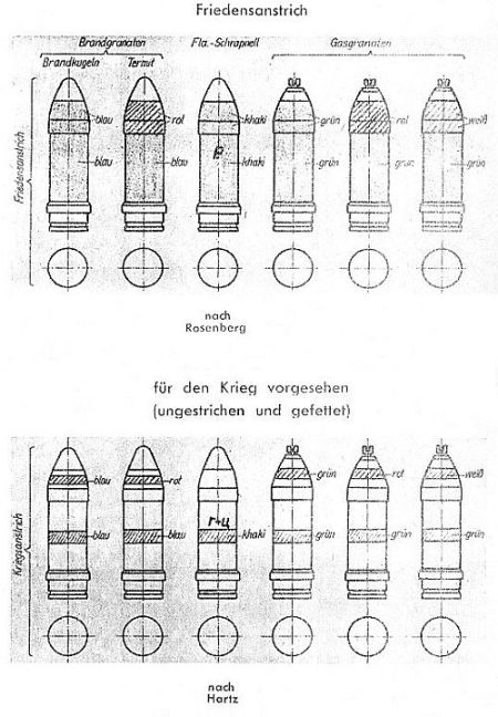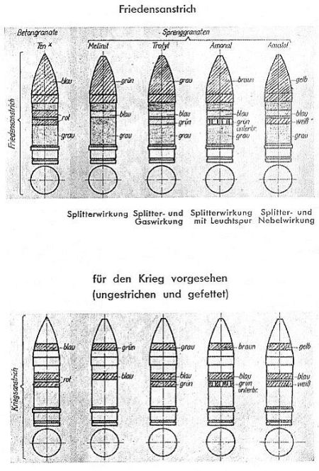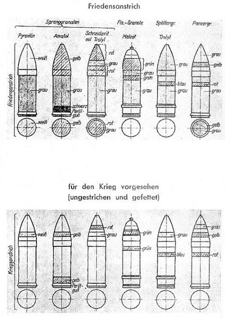 Bei Geschossen, die mit Trotyl gefüllt sind und Leuchtspurgeschossen fehlt in der Mitte des Körperes der Farbring, der die Sprengstoffart bezeichnet. |