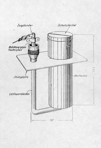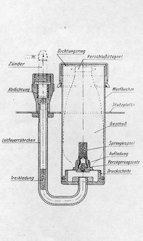 Die mit Deckel verschlossene Wurfbüchse nimmt das 60 mm Geschoß auf, das auf der am Boden der Wurfbüchse befindlichen Druckscheibe festgeschraubt ist. In dem Leit-feuer-röhrchen liegt die Treibladung zum Ausstoßen des Geschosses. Der Zünder ist am oberen Ende des U-förmigen Röhrchens eingeschraubt. Der Zündstrahl wird durch das U-förmige Röhrchen über einen Zwischensatz (Treibladung) an die Druckscheibe mit Geschoß geleitet. Einzelheiten siehe Bild 2.