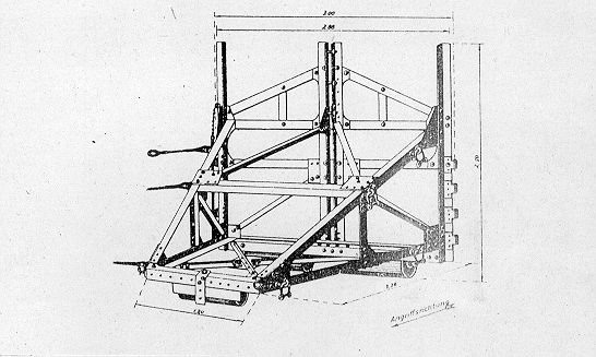 Grundfläche trapezförmig. Die lotrechte Vorderfläche hat 4 nach oben verlängerte und nach rückwärts verstrebte Pfeiler. Die Seitenpfeiler haben an den Außenkanten feste Halbscharniere, die so angeordnet sind, daß durch sie 2 benachbarte Gestelle mittels eines Scharnierbolzens schwenkbar verbunden werden können. Die beiden vorderen Walzenrollen sind fest, die rückwärtige drehbar angebracht.  |