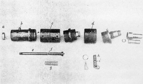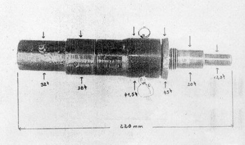 Die Hülse des Stabzünders ist aus einzelnen Teilen zusammengeschraubt. An der Stirnseite des Kopfstückes befindet sich eine Ausdrehung für die Schlagbolzenmutter a. Sie ist durch einen Stift gegen Verdrehen und selbsttätiges Lösen gesichert und beim zusammengesetzten Zünder mit Dichtungsmasse vergossen. Seitlich ist in dem Kopfstück eine Halteschraube b für den Bajonettverschluß des Verlängerungsrohres (Hindernispfahl) eingeschraubt. In das zweite Stück ist eine Ringnute c eingedreht (Knickrille). Im vierten Stück befinden sich zwei gegenüberliegende Schlitze d für den Sicherungsschieber h. Der Schlagbolzen e wird durch die Schlagbolzenmutter a unbe-weglich im Zünderkopf bei gespannter Schlagbolzenfeder g gehalten. Auslösung des Schlagbolzens erfolgt durch Bruch an der Knickstelle f, die beim zusammengesetzten Zünder in gleicher Höhe mit der Knickrille c der Hülse liegt. Der Sicherungsschieber h dient zum Auffangen des Schlagbolzens bei vorzeitigem unbeabsichtigtem Bruch des Schaftes an der Knickstelle. Bei gebrochenem Schlagbolzen faßt die Schlagbolzen-spitze in das Langloch i des Schiebers und verhindert ein Entsichern. Ein gewaltsa-mes Herausreißen des Sicherungsschiebers führt zum Zerknallen der Mine und ist verboten. |