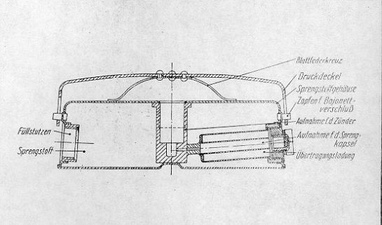 Der Druckdeckel wird durch eine vierfachen Bajonettverschluß mit dem Minenkörper verbunden und durch ein Blattfederkreuz in einem bestimmten Abstand über den Mi-nenkörper gehalten. Bei Belastung des Deckels wird das Blattfederkreuz auseinander-gedrückt und der unter dem Deckel liegende Zünder belastet und ausgelöst. |