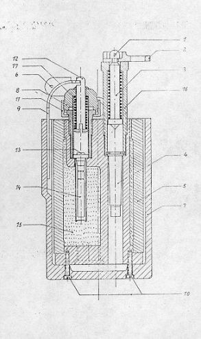 Betätigung erfolgt durch Sperr- oder Stolperdrähte, Fußschlingen oder dgl., die den Zugschieber 2 abziehen, so daß der Schlagbolzen 3 die Treibladungspatrone 4 (um-gearbeite Gewerhpatrone) zünden kann. Der Sprengstoffbehälter 5 wird ohne Verzö-gerung aus dem Ausstoßtopf 8 herausgeschossen. Die beiden Befestigungsschrauben 10 reißen dabei ab. Beim Verlassen des Ausstoßtopfes wird der Hebel 9 des Spring-zünders 8, der in einer Ausfräsung des Ausstoßtopfes gehalten wurde, frei, kippt un-ter dem Zug des Schlagbolzens 12 bzw. dem Druck der Schlagbolzenfeder 17 über und gibt seinerseits den Schlagbolzen 12 frei, der über Zündhütchen 13 und Spreng-kapsel 14 den Sprengstoff 15 zündet. Nach Angaben der Truppe zerknallt die Mine etwa 1,5–1,7 m über dem Boden. Die Verzögerung wird nur durch die Trägheit der Zündeinrichtung erreicht. Beim Zerknallen wird der gußeiserne Mantel des Spreng-stoffbehälters in kleinste Teile zerrissen.