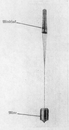 Nach Abwurf der Mine vom Flugzeug, wobei die Luftströmung durch den konischen, offenen Windsack streicht und die Fallgeschwindigkeit verzögert, löst sich im Wasser ein Salmiakstück. Der Minendeckel löst sich vom Minengehäuse, die Mine ist scharf und schwimmt, von den Schwimmkorken getragen, etwa 50 cm unter der Wasser-oberfläche. Stößt die Mine im scharfen Zustande entweder mit ihrem Minengehäuse oder mit den Stoßarmen an einen Gegenstand an oder werden die Korken festgehal-ten, so wird durch den Stoß oder durch den Zug der Korkleine die Zünderstange seit-lich verschoben und berührt den Kontaktring. Der Zündstrom ist dann geschlossen und die Mine zerknallt. |
