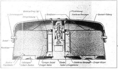Der Druckdeckel wird durch einen vierfachen Bajonettverschluß mit dem Minenkörper ver-bunden und durch ein Blattfederkreuz in einem bestimmten Abstand über dem Minenkör-per gehalten. Bei Belastung des Deckels wird das Blattfederkreuz auseinandergedrückt und der unter dem Deckel liegende Zünder belastet und ausgelöst. |