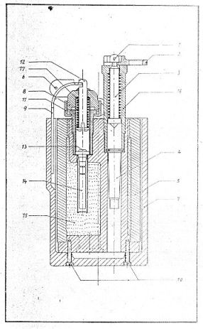 Betätigung erfolgt durch Sperr- oder Stolperdrähte, Fußschlingen oder dergl., die den Zugschieber 2 abziehen, so daß der Schlagbolzen 3 die Treibladungspatrone 4 (umgear-beitete Gewehrpatrone) zünden kann. Der Sprengstoffbehälter 5 wird ohne Verzögerung aus dem Ausstoßtopf 7 herausgeschossen. Die beiden Befestigungsschrauben 10 reißen dabei ab. Beim Verlassen des Außstoßtopfes wird der Hebel 9 des Springzünders 8, der in einer Ausfräsung des Außstoßtopfes gehalten wurde, frei, kippt unter dem Zug des Schlagbolzens 12 bzw. dem Druck der Schlagbolzenfeder 17 über und gibt seinerseits den Schlagbolzen 12 frei, der über Zündhütchen 13 und Sprengkapsel 14 den Sprengstoff 15 zündet. Nach Angaben der Truppe zerknallt die Mine etwa 1,5–1,7 m über dem Boden. Die Verzögerung wird nur durch die Trägheit der Zündeinrichtung erreicht. Beim Zerknallen wird der gußeiserne Mantel des Sprengstoffbehälters in kleinste Teile zerrissen. |